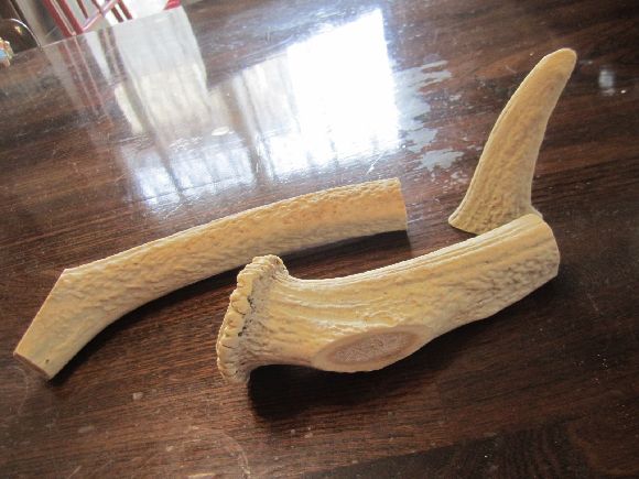 最初の写真が以前に革砥を作った時の小振りの鉈です。鹿角も使えそうなものが有りサイズ取りをして切りました。