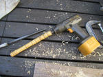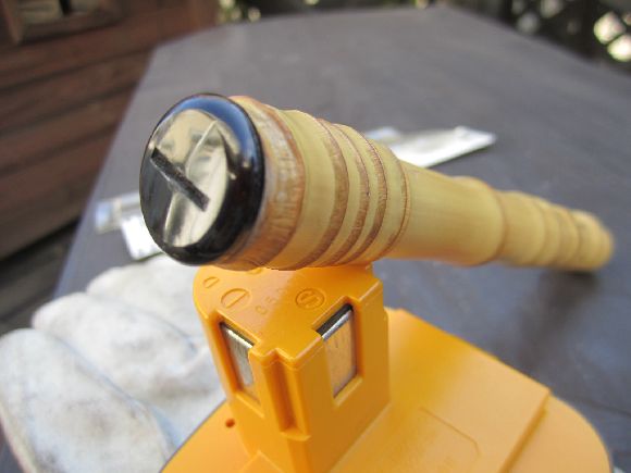 写真の通りしなりの硬さと節の硬さでドリルで歯が立たずインパクトドリルでの貫通となりました。竿のつけ根はカットして両側から合わせました。一番難しかった場所です。