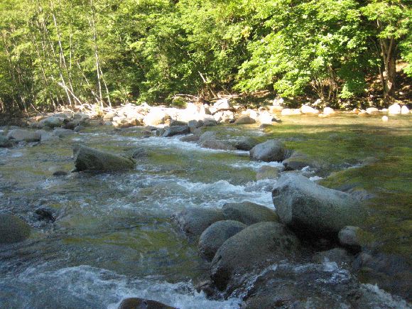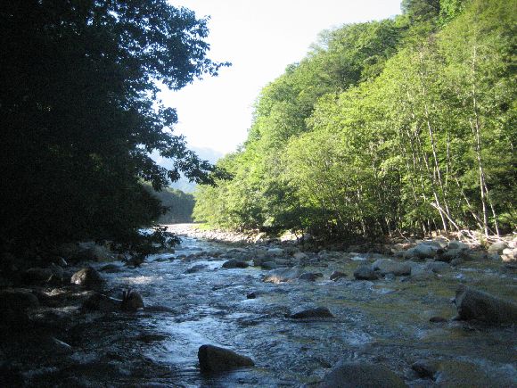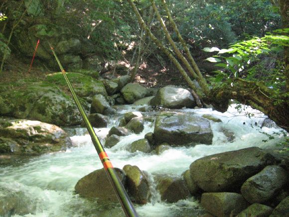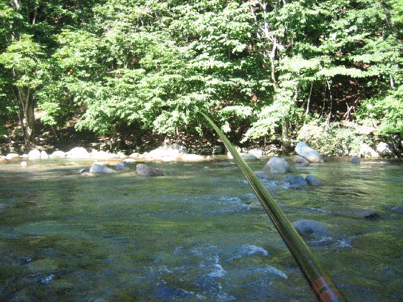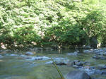 笛吹本流はこの時期にしては水が多めでした。八月の川はお客が多く場荒れしています。