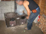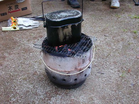 のんびりとかまどでご飯を炊きます。見かねたオーナーさんが友人に手を貸してくれました。(^^;)