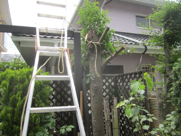 こうなると早めに手を打たないと切った枝の処分に苦労する住宅地ですから必死の剪定作業です。