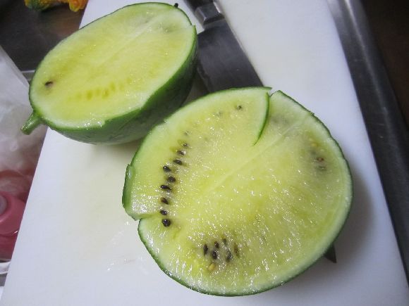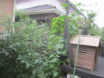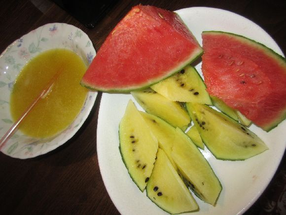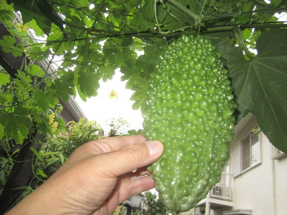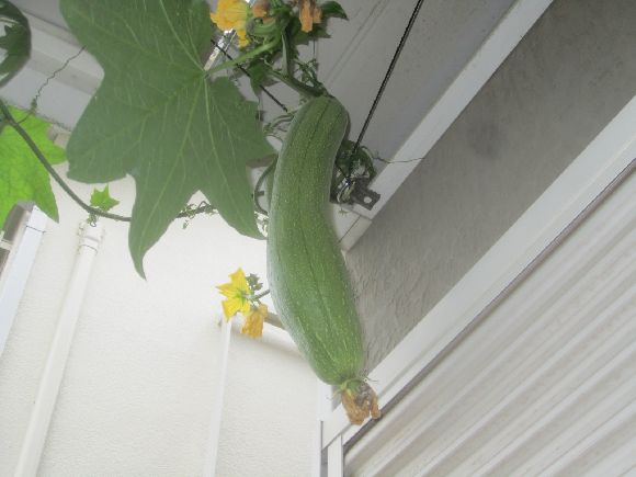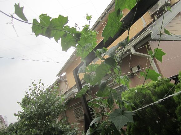 スイカとゴーヤは順調でデッキの端から家の壁まで届きました。
