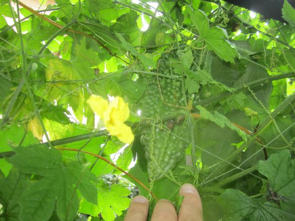 ごちゃごちゃに伸びるツルを辿りましたら現在それぞれに実が一つづつ生っています。