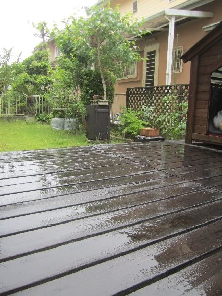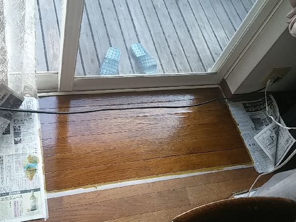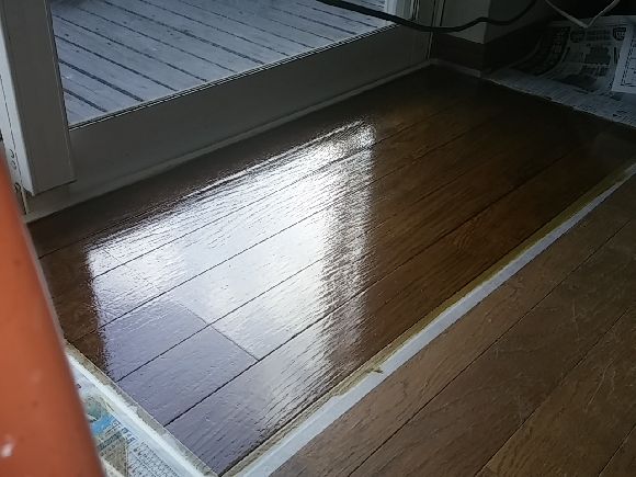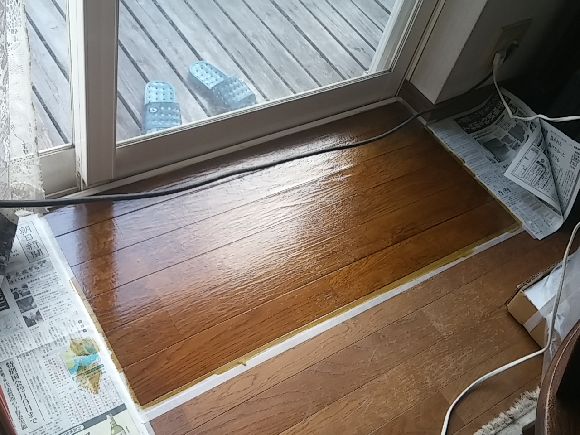 先日もデッキへの出入り口のフローリングが剥げてきて浮いた状態でしたので部分補修はややみっともないのですが傷むよりいいので化粧版の接着と手元にあった水性のウレタンニスで仕上げました。表面だけの傷みなら結構良い結果にできました。