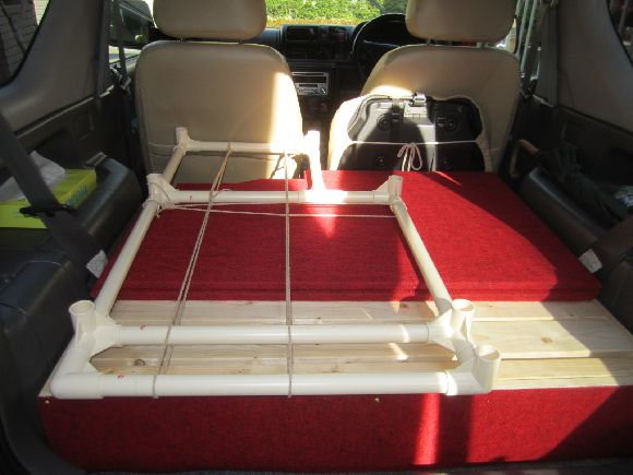 先日の車中泊ベッドにパンチカーペットの追加と収納確認、ポールが一本入りませんでした(笑)
