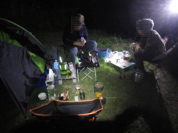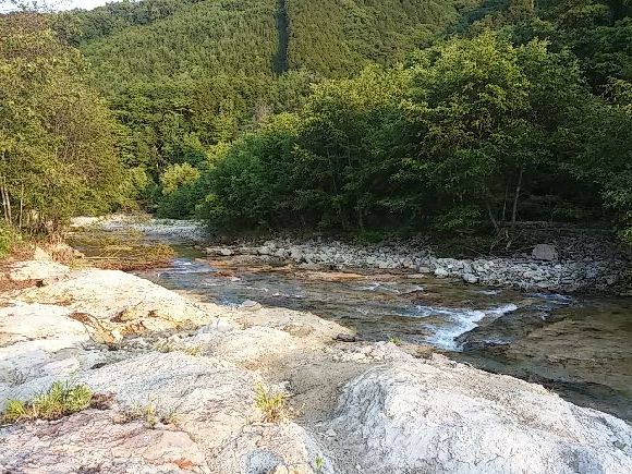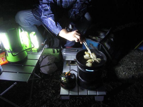 翌日は早めに帰路につきますので温泉で癒してから本流際のテント場でラストナイト語り合いました。