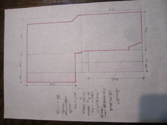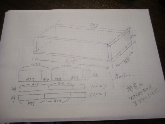 寸法図が少々見づらいですが厚みは19mmです。底板は1×4で最終調整すればいいかとスタートはアバウトでしたが最終的には良い納まりになりました。