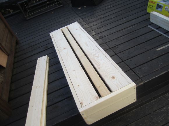 上部の蓋は手間のかからない板を三枚乗せた簡単な作りにしてあります。収納を兼ねています。