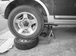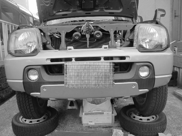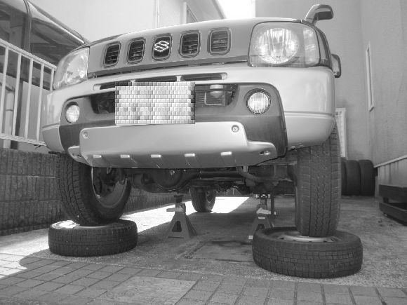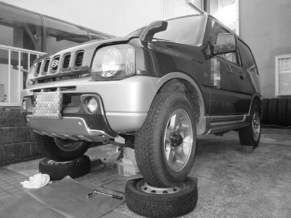ジムニーは車高が高いが作業しやすいようにタイヤに乗せていますが慣れない人はきちんとジャッキUPとスタンドやタイヤ止めと安全対策をしてから作業するようにお勧めします。