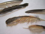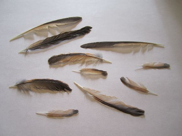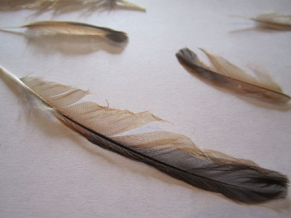 野鳥の羽、わたしもツグミじゃないかなと思います。野鳥は固くて巻きにくいかもしれませんが、茶色と黒が混じってる辺りはおもしろい毛鉤ができそうですね(^_^)