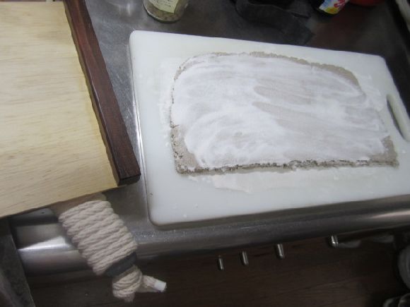 その後全体を一つにまとめていきます。蕎麦の中の空気を送り出すように丸めて短い麺棒で伸ばします。二人分ぐらいでしたらまな板の上で二枚折に出来ます。打ち粉の代わりはコンスターチを少量、くっつかない程度に使います。