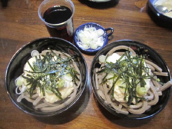とろろ芋を乗せてネギ、のりとわさび、つゆは市販のそばつゆで良いと思います。