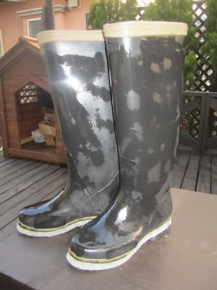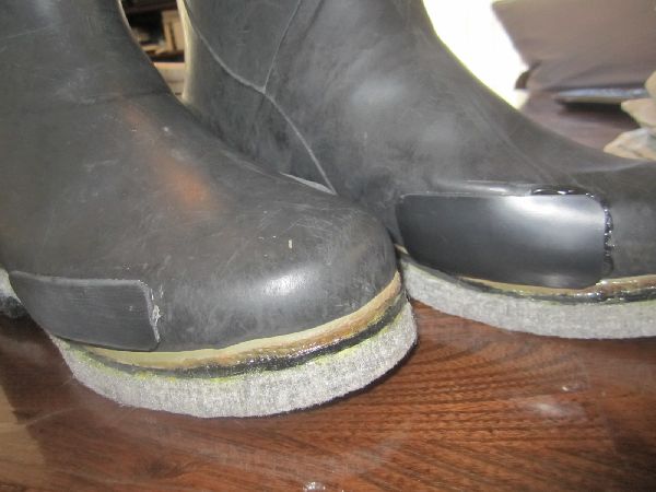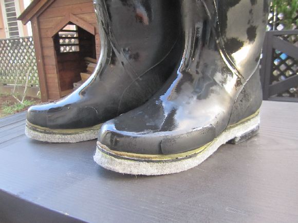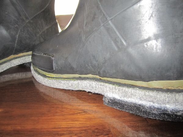 田植え用の長靴を渓流用に作り替えた関係でゴムが少し薄く、岩とかが長靴のサイドに当たると少し痛いのでサイドに当てゴムを貼り加えました。使用にどの程度耐久性が有るかは使ってみないと分かりませんがサンドペーパーでパンク修理の工程で貼りました。