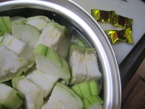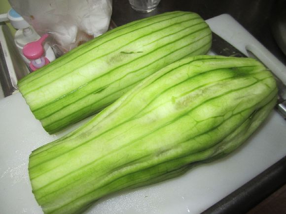 ヘチマの皮をむき1cm程度にスライスします。とろけて小さくなりますし種も柔らかく美味しいです。皮をむいてからへちまを手早く切らないとヘチマの表面が変色します。食べるには問題ないですが知らないと傷んだように感じます。
