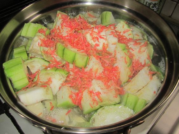 さくらえび適量、コンソメチキンを3粒を鍋に入れ水を7分ほど加えて煮込みます。