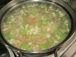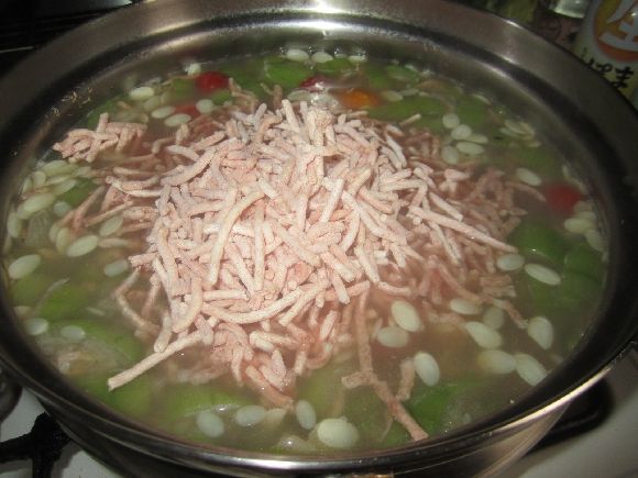 全体が柔らかくなったら豚バラかひき肉を適量入れ蓋はせずに沸騰させます。蓋をすると肉の臭みが出ますので注意です。