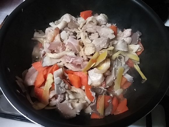 そしてヒラタケの炊き込みご飯を作りました鍋で具を炒めてから湯を加えて煮ます。