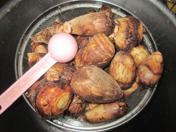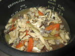 ピーピーピー♪と鳴ったら出来上がりです。キノコが取れない自分は農産物直売所からキノコを購入することしかできないので種類は限られます。^^; 収穫したサトイモも入ってます。