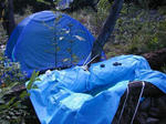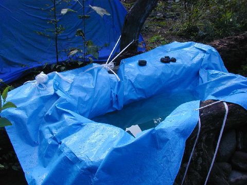 後はたき火で大型オイル缶で湯沸かし、沸騰した湯を三杯+沢水で熱めにうめて完了です。