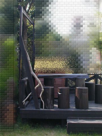 ウッドデッキにタツコと無垢板のテーブルをセットしました。