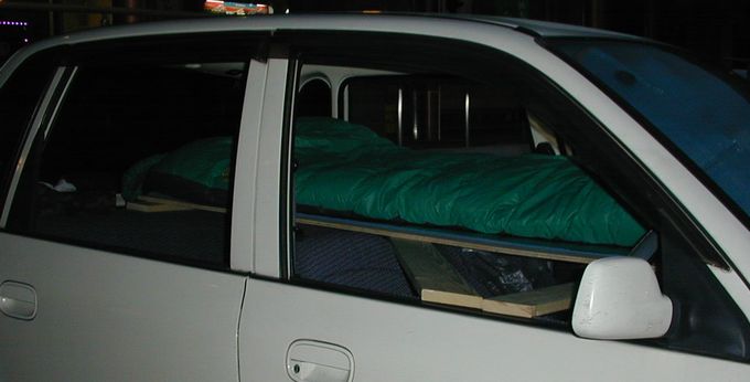 最近は道の駅などでワゴン車などのキャンパーは多く見かけますが軽ワゴンよりもさらに小さいセルボモードキャンパーは居ないのでは(^^;)夜間到着の林道泊もこれで楽になりました。(運転席側からの状態)