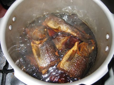 (我が家の圧力鍋はこなべの為鱒は焼いた後半分に切りました)