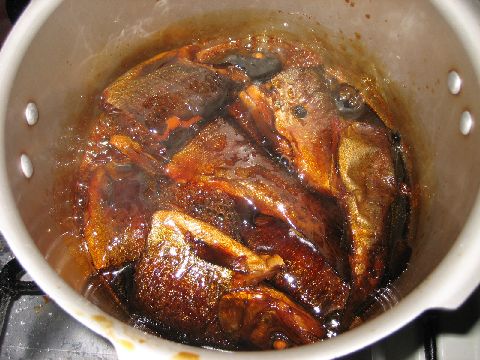 全体に煮詰まるように時々魚の向きを変えたり煮汁を上からかけて煮詰める。