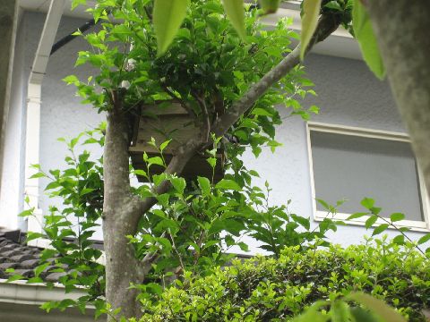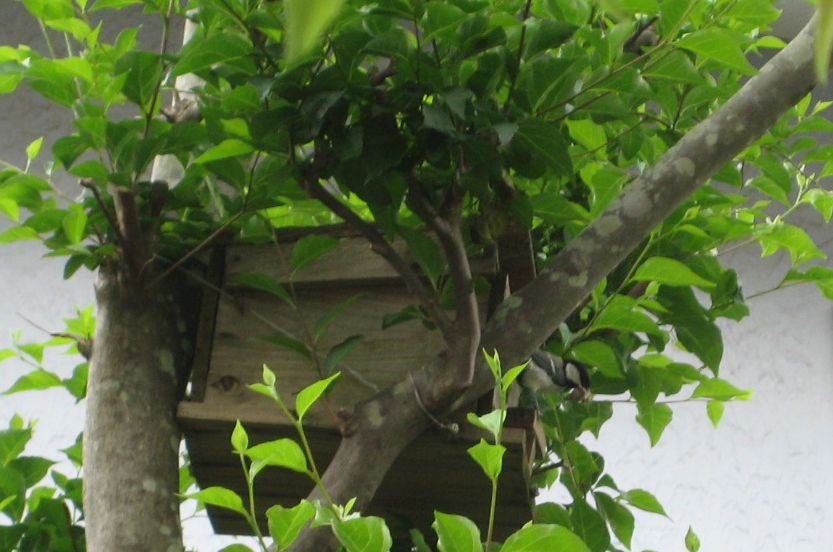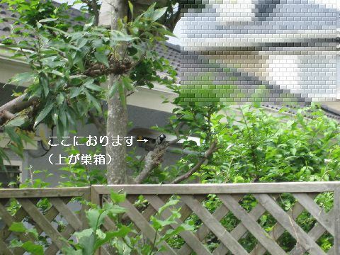 巣箱の前にえさをもっています。コンパクトカメラなのでズームもここまで。