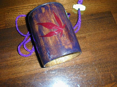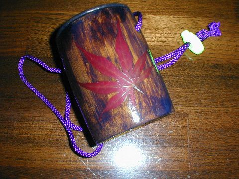 以前に自作しました竹のえさ箱に紅葉の葉を前後に塗り込みました。
