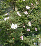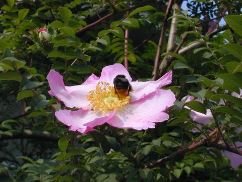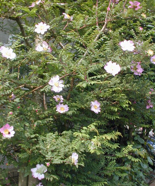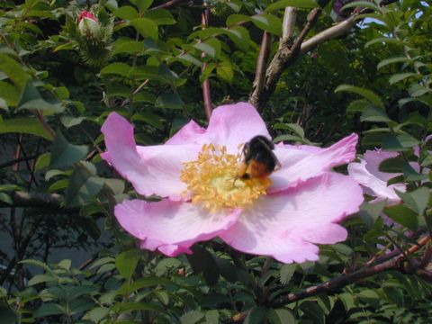 14~5年前から植わっている原種の薔薇です。植えたものでは無いのですが造成時に有ったのか?別名箱根山椒薔薇です。去年あたりが多くの花をつけるようになり今年が一番多いです。そして今年の新顔は蜂??です。今朝見ましたら群がるように花に留まっています。蜂の名前も分かりません。どなたが知りませんか?
