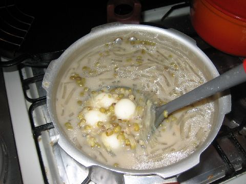 緑豆200gを圧力鍋で10分煮込んでココナッツ缶詰一缶を