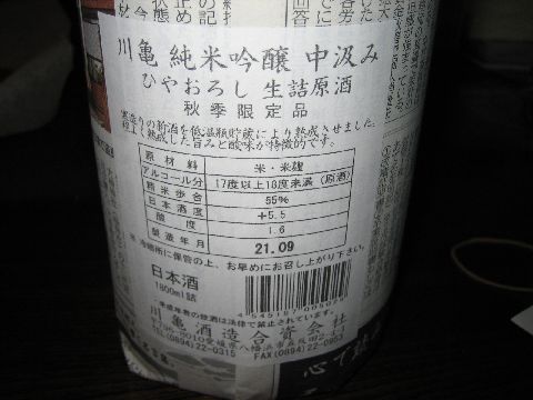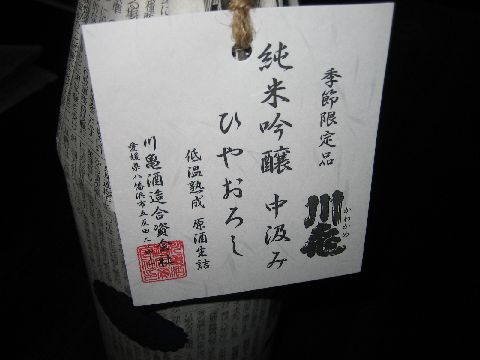 本日のお酒は季節限定の 川亀 純米吟醸 中汲み ひやおろし(愛媛県)