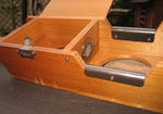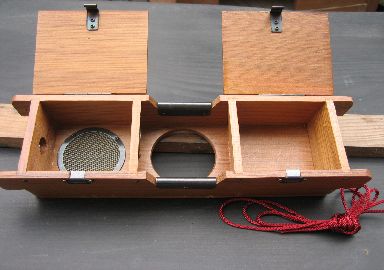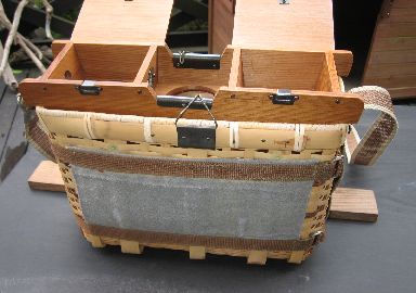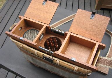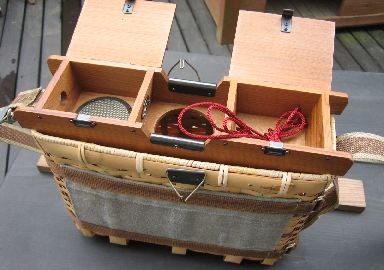 早速自分用にちょいと手直し、ネジ増す締め、初代の師匠から頂戴した魚籠に使用していた背負い紐をこの三代目魚籠に取付、バンド通しの金具の取り外し、えさ箱の落下防止用紐を取付。