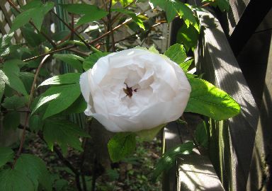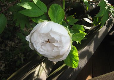 今年は花が一つです。ウッドデッキの陰に隠れています白色の牡丹です。