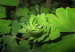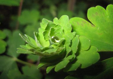 オダマキの葉につくしずくが輝いています。綺麗な光です。
