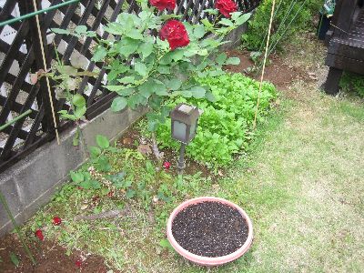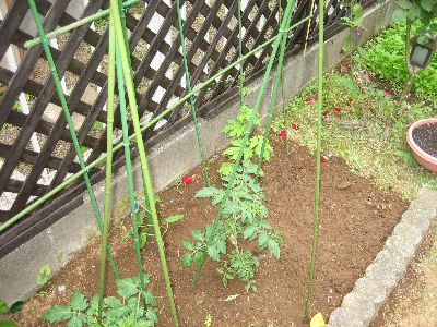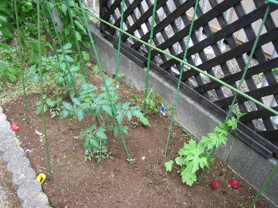こちらは先日植えたトマトとゴーヤです。ゴーヤはメンテ中にツルを痛めたので一株追加して沖縄ゴーヤを植えました。