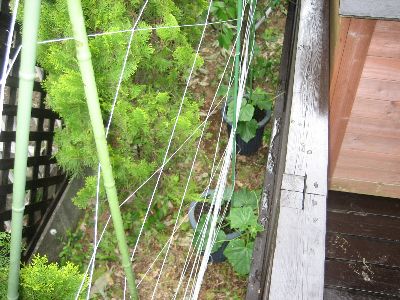 デッキのメンテナンスが終了したのでその後にネットに這わすきゅうり、ヘチマを植え付けました。