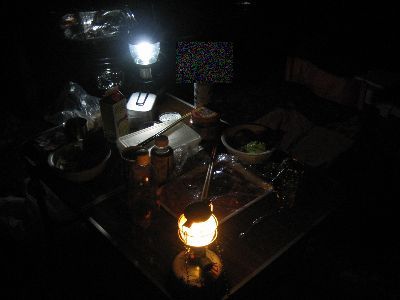 師匠との焼き肉の宴です。沢の音、たき火、旨い酒と肴、天界の心地よさ。
