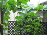 ヘチマのツルは一気に勢いを増しました。根元の葉は直径10CM程度ですが天井部分の葉は直径30CM程あります。これでうまくネット全体に這わせることが出来れば涼しいクリーンカーテンが完成します。