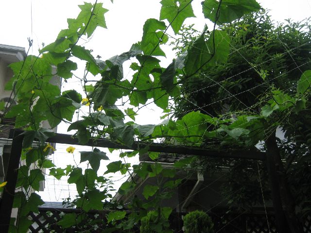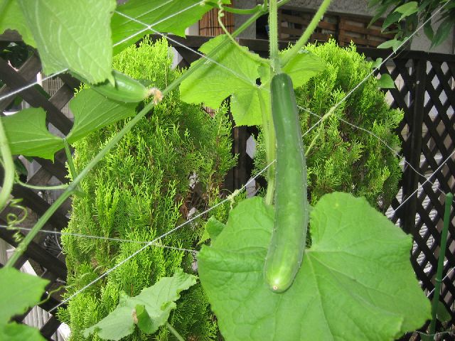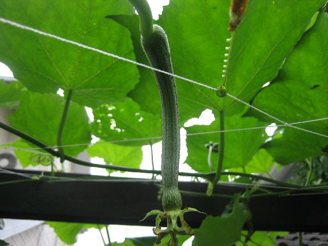 ヘチマの実も大きくなり始めています。写真の一枚はきゅうりです。