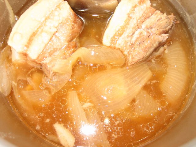 手軽に簡単に豚の角煮+たまねぎ!圧力鍋で軟らかく煮ます。