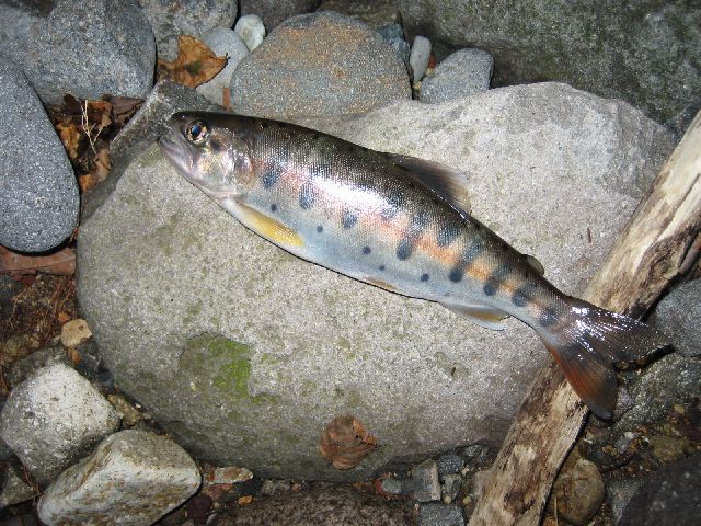 続く一尾は大岩の下、奥から出た同サイズの岩魚です。これだけでも充分に満足。