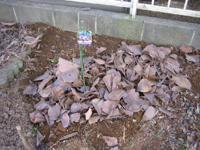 有機質のマルチをタップリと敷くのが良いのですが枯葉をかぶせました。