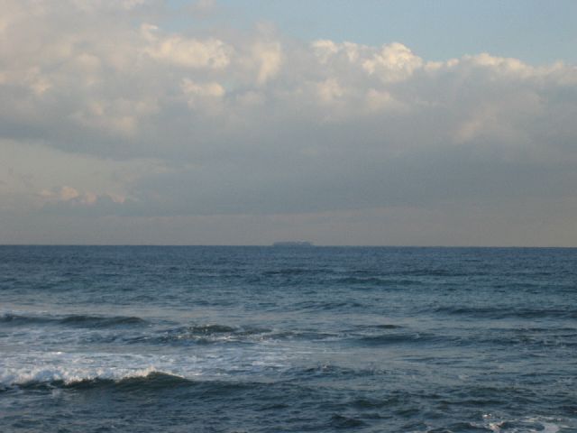海の向こうに見えるのは巨大タンカーです。かなりのスピードで航海しています。