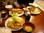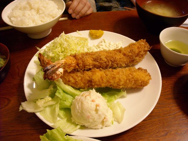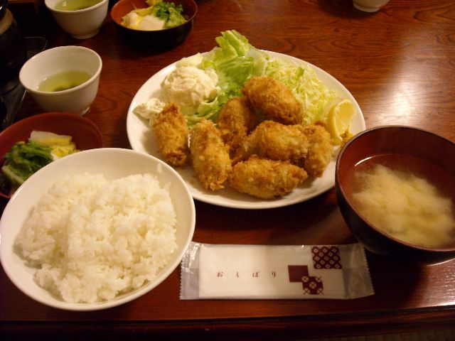 エビフライはこれが普通でこの上の超でかいのもある。このサイズは味が濃厚でサクッと美味しい。エビフライ定食1800円。牡蠣フライ定食はご覧の大きさにボリューム満点!牡蠣フライ定食で980円、いつも満席な訳ですね。