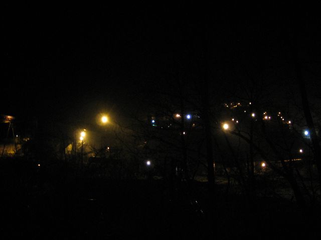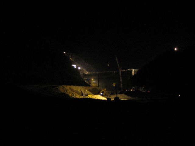 湯西川ダムの工事現場、夜のライトは幻想的で映画の中にいるようです。夜にもかかわらずダンプが走り重機が唸りをあげています。