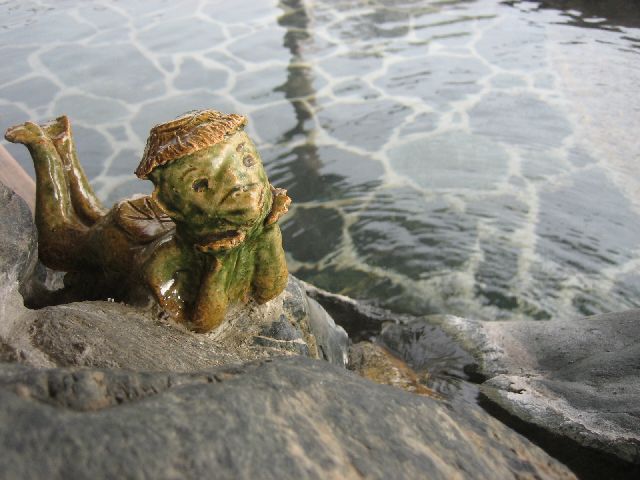 駅前の景色はひと味違います。雨でも楽しめるこの穏やかな空間。足湯を守る河童さん