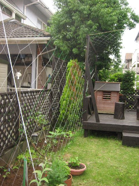 そしてグリーンカーテンを大きくすべくきゅうりネットをたっぷり張り込みました。