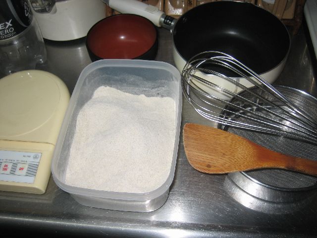 そば粉80グラム水200CC。道具はご覧の通り。香り良いそば粉です。
