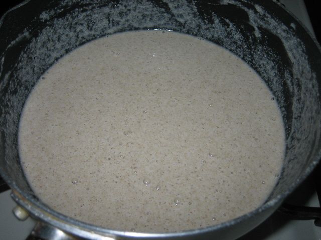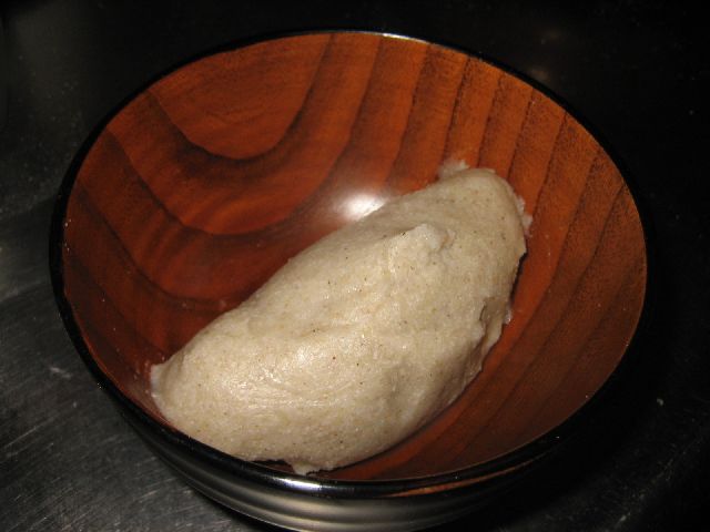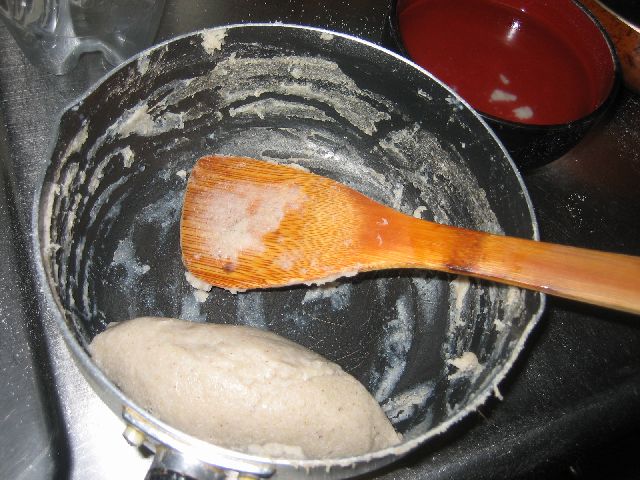 水とそば粉をとろっとするまでよく混ぜます。この時点で蕎麦の香りがとても良いです。